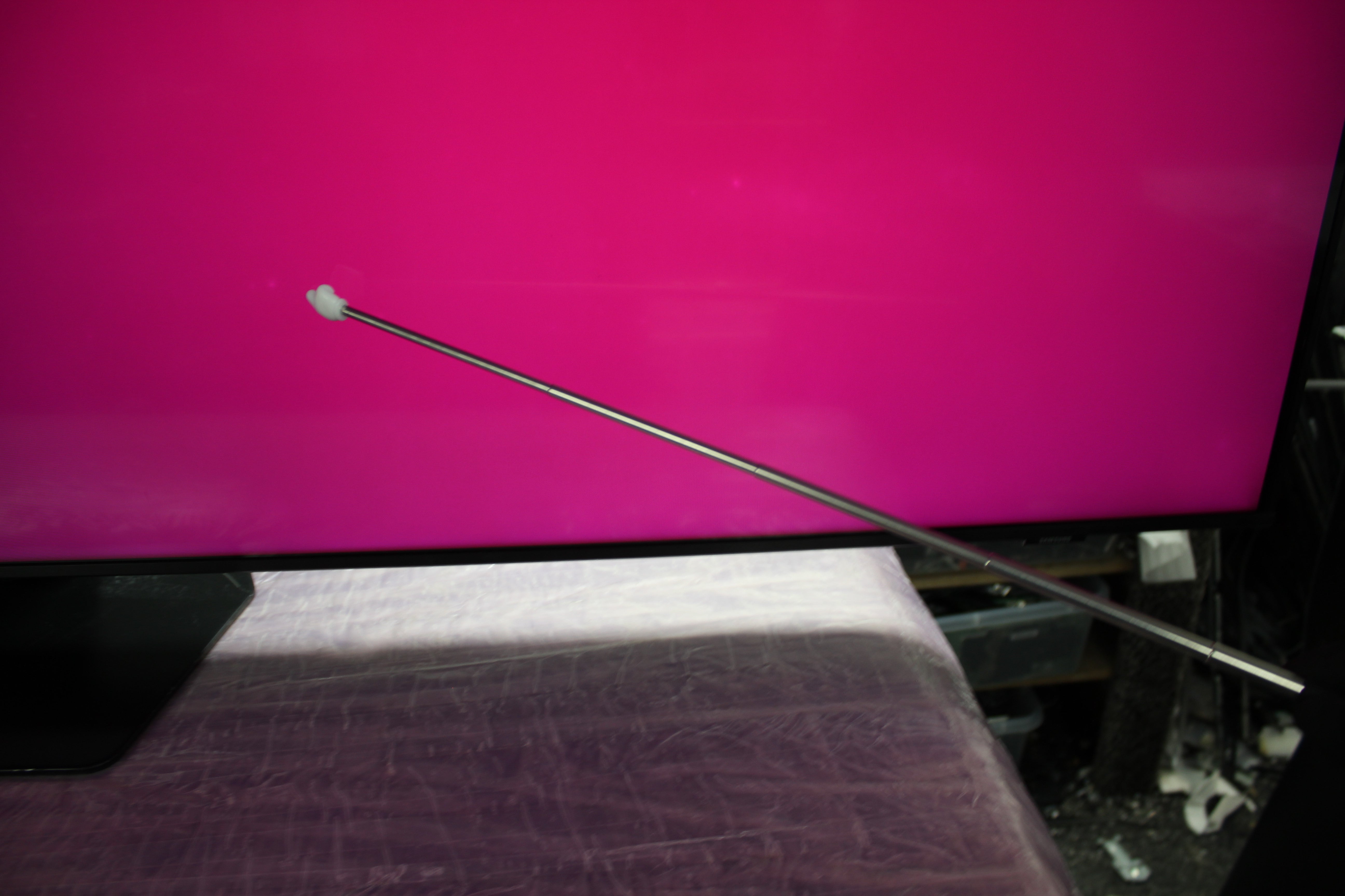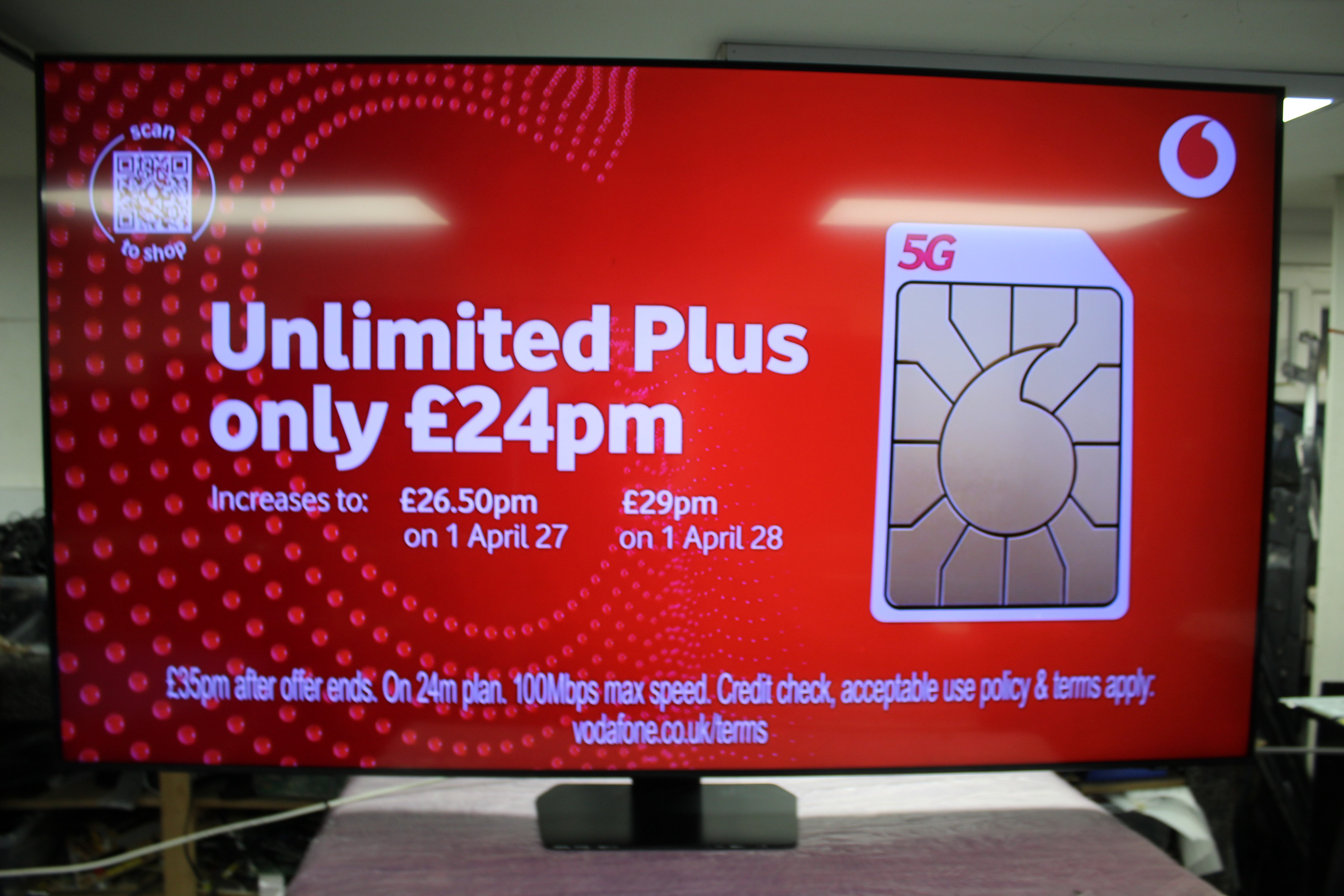Item is supplied without tabletop stand therefore must be wall-mounted. There are tiny marks inside the screen but these are not visible when watching the tv. See pictures for more details.
